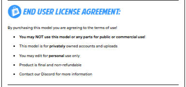 IMPORTANT INFODue to how the models were made, the design has to be symmetrical on both sides. Apologies for the inconvenience, this is something we cannot change or fix unfortunately.All AVIs will be tested in-game and checked for errors and quality assurance.Before receiving your AVI, a photo will be sent, if satisfied, a clone link or request to join in-game will be given or asked.Instructions on how to upload/apply avatar textures will be provided upon completion and after purchase!If your model is somehow stolen/cloned in-game, contact us immediately!(PC PREFERRED BUT NOT REQUIRED)We reserve the right to refuse commission services with anyone not willing to comply with Spider-Lair policies.If you have any questions regarding commissions,